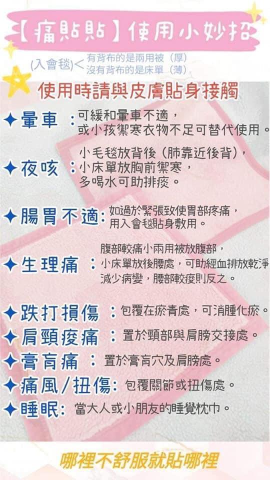 ◆腸胃不滴:如過於緊張致使胃部疼痛,用入會毯组貼身敷用。